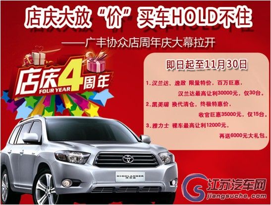【评估有礼】 现场专业评估师免费评估,活动期间到店评估即赠精美店庆好礼一份; 【独享优先提车权】 第七代凯美瑞创世登场,现火热预定中,置换成功即可尊享第七代凯美瑞优先提车权; 【二手车成功置换尊享两个月固封保值政策】 任意车型成功置换新凯美瑞,可享旧车换购价格保值两个月; 【成功置换独享2年或4万公里常规免费保养】 活动期间成功置换新凯美瑞车型,独享2年或者4万公里常规免费保养,省钱又省心。 本月广汽丰田协众店店庆活动全面展开,凯美瑞、汉兰达、逸致、雅力士全系车型百万巨惠、礼献全城,全面满足消费者味蕾,店庆促销活动火热进行中。 ① 汉兰达、逸致限量特价,汉兰达最高让利30000元 ② 凯美瑞终极特惠,收官巨惠35000元 ③ 雅力士现金让利高达18000元,再送6000元大礼包,创车市优惠之最 本月购买任意车型,均可参加免息超低首付购车活动,广丰协众店周年庆多重优惠本月精彩呈现。