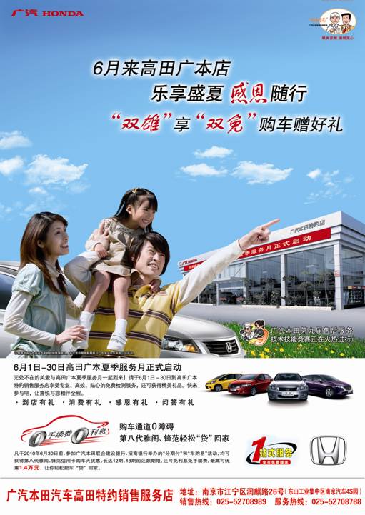 本文关键词:高田广本 广本 广本夏季服务月 高田汽车 江苏汽车网 6月1日—30日高田广本夏季服务月正式启动,高田广本店为感谢广大用户的支持,在“乐享盛夏感恩随行”夏季服务月期间,来店客户在畅享“感恩多重礼”“专业车辆免检等回馈活动,实惠多多、赶快行动! 于此同时活动期间购雅阁、锋范可享受12、18期免手续费免利息车贷服务,让您轻轻松松把车“贷”回家 江苏高田汽车销售服务有限公司 活动内容: 一、到店有礼 1、活动期间享受全车油液系统、电器设备、空调系统、行驶系统等多项免费检测。 二、消费有礼 1、活动期间进场保养、养护工时8折巨惠。 三、车主课堂 诚邀您于6月20日上午10点参加高田广本店车主课堂,金牌讲师将为您讲解车险知识、配件知识、用车常识等,届时会有短信通知。活动详情电询:025-52708788