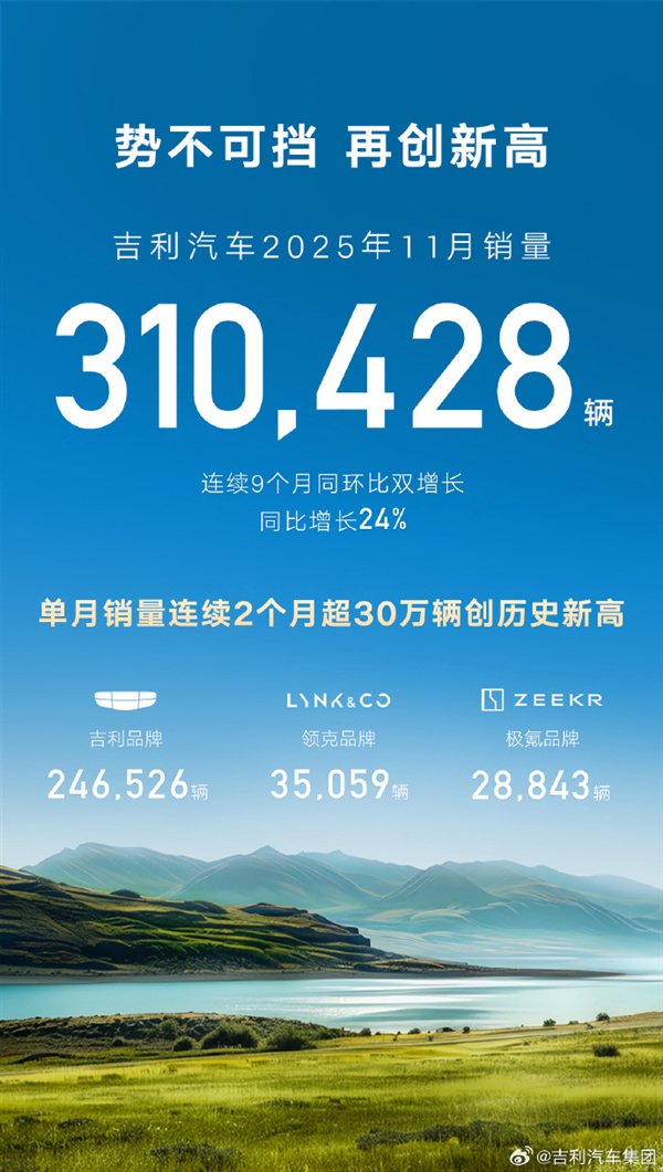 11月,吉利乘用车销量310428辆,同比增长24%,再创历史新高,已连续9个月保持同环比提升。