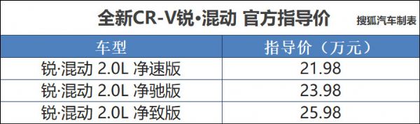 如果您只考虑四驱车型,要在这三款四驱车型中选择的话,那么我依然推荐豪华版,它比尊贵版便宜1.8万元。仅仅是少了电动后备箱、18寸轮毂、并线辅助、LED大灯、后排座椅加热这几个配置,而这几个配置在日常使用中都属于“锦上添花”的功能,有没有意义不大,而如果您预算充足的话又另当别论了,但到了23万元的价位,好像也能买到不少中型SUV了吧?至于指导价24.98万元的尊耀版,多出来的主动安全配置更称得上是“锦上添大花”,花将近25万元买CR-V,我个人认为这个行为稍有一点“石乐智”。 ● 2.0L锐·混动 净速版/净驰版/净致版 ● 指导价格:21.98/23.98/25.98万元 ● 推荐车型:2.0L 锐·混动 净驰版