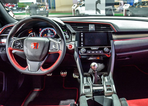 新思域TYPE R原型车的内饰在布局上与新思域并无太大差异,包括液晶屏仪表盘、仪表台、三辐式多功能方向盘等均维持了后者的样式。但在细节上,TYPE R原型车的设计则要更具运动气息。新车的多功能方向盘采用了与新思域普通版车型相同的三辐式设计,二者的按钮布局与辐条造型完全相同,仅外部握把部分采用了红黑双色的平底式设计,更加符合TYPE R的性能车定位,当然,方向盘中央的本田LOGO也被替换成为本田品牌性能车专属的“红章”。