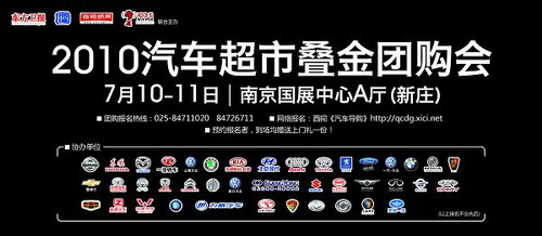 今天你降八千,明天我降一万,各家降的是不亦乐乎,其实有经验的买车人都清楚,一年之中最优惠的购车政策不在年底,而是传统销售淡季——7-8月!汽车厂商为消化库存,及时回笼资金,往往会在暑期拿出最丰厚的优惠!    打造南京车展最强品牌   汽车超市七月再出击     神秘巨惠即将登场  叠金团购再掀车市新风暴 预约报名者,到场均赠送上门礼一份!     活动名称:2010汽车超市叠金团购会 |