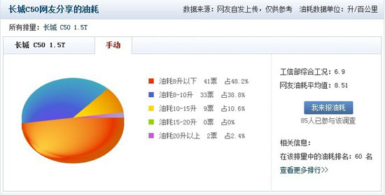 本文关键词:帝豪EC7 和悦 宝骏630 逸动 长城C50 V5菱致 长城C50 市场报价:6.70万-9.18万 油耗方面: 长城C50 固然没有引入直喷技术,然而搭载1.5T涡轮增压发动机之后,实测的加快工夫也已达到9.7秒,连贯性不错,无论是高速行驶还是起伏的山道,它都没有浮现“疲软”的状态。油耗方面也有定然的优势,工信部给出的综合工况油耗为6.9L,网友给出的油耗均匀值为8.51L。 ![]() 假如针对大城市干道中 使用的话,城市 路径 比较拥挤,特殊是赶上早晚巅峰,低速运行或是走走停停的状况十分多,但 即便如此,您也觉得不到涡轮的介入,体现根本与1.5L自然吸气发动机相当,起步够用,爬坡稍显吃力,油耗维持在7.51L/百公里。假如是针对小城市或者县城而言,那么油耗的体现会更加出众,与同级竞品相比体现上乘。 ![]() 售后费用: 通例用车费用方面,依据北京地域车船税 标准,1.0L-1.6L(含)排量车型的征收 标准为420元/年,所以长城C50每年的车船税成本为420元。日常保护费用包含洗车和打蜡,依照均匀洗车价格每次25元和打蜡100元计算,每月洗车3次,每年打蜡三次,V5菱致一年的日常保护费用均为1200元。 售后保养费用方面,与合资品牌相比,C50的保有量并不大,售后维修点也不如一些合资品牌宽泛,但作为长城汽车[报价 4S店]的一款热售车型它在保护保养方面绝对容易,同时费用方面也要实惠许多。其通例保养费用仅在200元左右,其中在机油+机滤147元、空调滤清22元、汽油滤清18元、空气滤清35元、火花塞23元*1支、刹车油38元,这些就是C50的通例保养成本。在保修方面,厂家为C50提供了4年15万公里的品质保修(以先到为准),这项政策针对全部购买长城C50的用户,在质保期内车辆所产生的非人为引起的机械故障,都 可以到4S店进行免费索赔。 车型简介: 外观方面,长城C50依然采纳了家族史的鲨鱼嘴前脸造型,整个车头看上去十分动感。