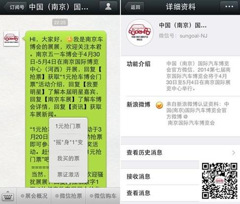 全新升级 娱乐、钜惠双丰收 2014南京车博会将打造体验式车展,靓丽超模汇聚,豪华超跑云集,各类品牌活动缤纷开展;现场也将推出更多汽车主题活动:最美车模选拔大赛、主题摄影大赛、寻宝抽奖等趣味增值活动一应俱全;影视歌重磅明星见面会,与现场幸运观众激情互动获亲笔签名礼遇。 五一南京车博会拥有上半年绝无仅有的抄底优惠!2014款全新车型、清新优雅车模激情演艺享不停,在室内带您感受南京春季的美好。 官方微信更多玩儿法知多少? 2014南京车博会“全民选举车展明星”活动全面展开了,诚邀爱生活、爱香车、爱明星的你参与选举出席车博会现场的明星嘉宾咯! 赶快搜索关注车博会微信“sungoal-NJ”(或扫描二维码添加关注)参与互动吧! 点击聊天界面屏幕下方功能菜单查看近期新闻资讯、车博会在线答疑、观展指南;回复“来一个”调戏官方微信精灵展展,你也可以直接留言给展展,把你的疑问、好奇、意见向展展大声说出来!如果你喜欢我们的车展,请多夸夸展展,猜猜会有什么样的惊喜等着你? 点击查看南京国际博览中心地图:http://j.map.baidu.com/Bg8Vq 2014第七届中国(南京)国际汽车博览会 新浪微博:http://e.weibo.com/nanjingchezhan 腾讯微博:http://t.qq.com/njautoshow 官方微信: