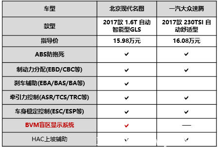 第三回合:比战略武器 新名图使出杀手锏 军迷们都知道,战术武器的攻击范围是有限的,而战略武器才能大面积摧毁纵深目标,是战争中克敌制胜、逆转绝杀的关键。但对于我们日常行车而言,战略武器绝不是动力,而是安全,因为安全才是每个人最核心的需求。行驶在路上,只有踏实的安全感,才是一辆车真正的精髓。 在安全配置方面,新名图和速腾都毫不含糊。在两款售价相似车型的配置表中,我们可以看到这款实力车型都配备了ABS、EBD、ESP、刹车辅助、ASR牵引力控制、上坡辅助等安全配置。但是,新名图配备了同级罕有的BVM盲区显示系统,不仅凭借强大的科技实力傲视同侪,更实现了对速腾等车型的全面碾压。