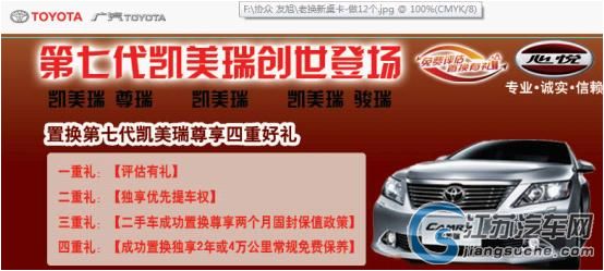 本文关键词:南京广汽丰田凯美瑞优惠活动 第七代凯美瑞即将上市,“凯美瑞·骏瑞”、“凯美瑞”、“凯美瑞·尊瑞”三箭齐发,三款车型价格也即将在12月初发布。为此,广丰协众店在此期间开展“价格竞猜,乐享好礼”活动,即日起至新车价格发布前(具体以广汽[报价 图片 4S店 新闻] 丰田[报价 图片 4S店 新闻] [报价 图片 4S店 新闻] 价格发布日期为准),参与活动即享精美礼品,更有惊喜幸运大礼——时尚ipod以及七代凯美瑞原厂车模大放送,期间第七代凯美瑞全面接受预订。