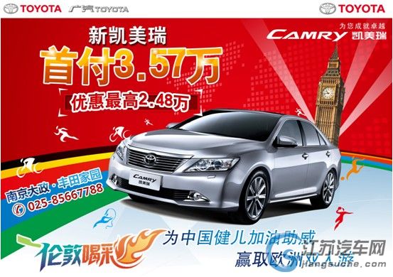 同期,江苏建行重金买断南京大政丰田20台新凯美瑞,倾全力打造“全国独家首付二成” 新凯美瑞专属金融车型,该车型首付仅需3.57万,真正实现“0”利息、“0”手续费,综合优惠高达2.48万,2012年史无前例超值优惠,岂能轻易错过?车型限量,活动特供20台,订完即止。