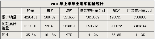 2010年前6月销量 轿车转冷/MPV持续热销 |