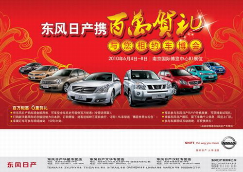 本文关键词:南京汽车博览会 东风日产 经销商 南京车市 江苏汽车网 2010年6曰4日-8日,一年一度南京国际汽车盛宴——第三届南京国际汽车博览会即将在河西南京国际博览中心正式拉开帷幕。广大南京市民也将迎来2010年年度最佳的特惠购车良机!