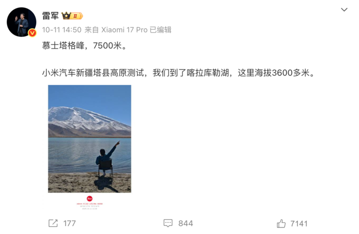 雷军在 10 月 11 日下午在微博上分享了一条动态,「小米汽车[报价 4S店]在新疆塔县做高原测试,我们到了喀拉库勒湖,这里海拔3600多米」,之后又补充到「实际测试地在帕米尔高原,平均海拔超过4000米,有20多位工程师在这儿,他们主要测小米YU7的高原续航、充电情况还有防晒性能。」