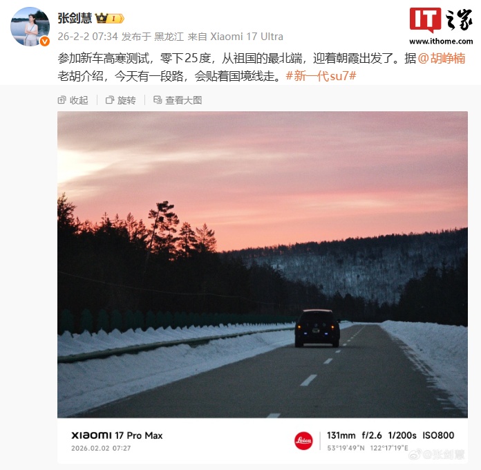 注意到,小米集团副总裁、采购委员会主席、资产与工程管理部总经理张剑慧今日也在微博透露了新车进展,称参加新车高寒测试,今天有一段路,会贴着国境线走。其分享的图片展示了汽车动态情况,可以看到小蓝灯点亮上车。